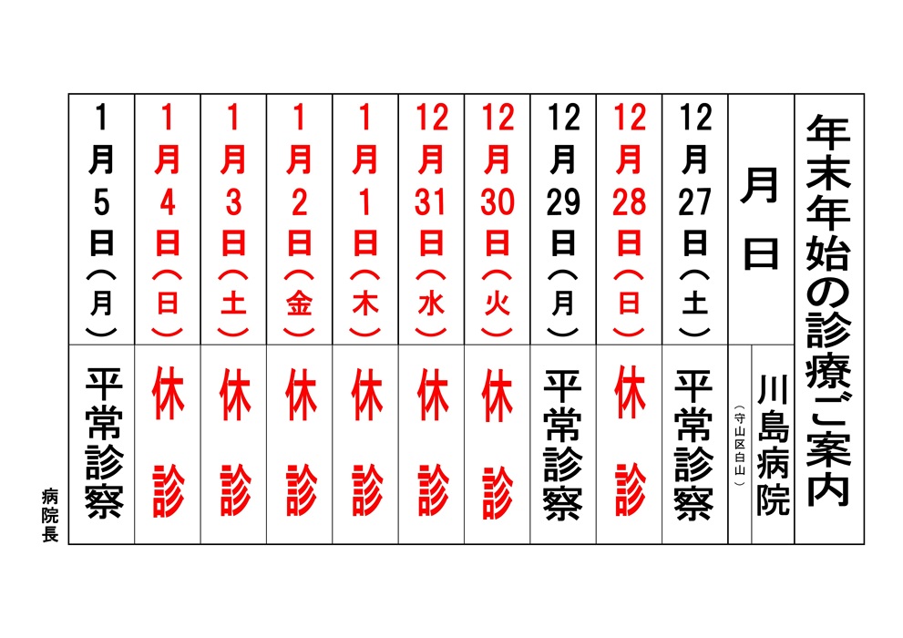 水曜・土曜午後・日曜・祝日は休診日(面会は可)